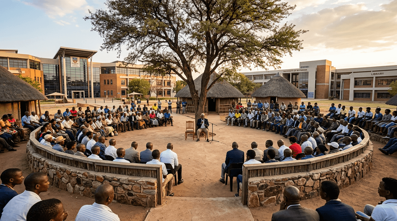 In every Tswana village, town, and city district, the kgotla -- a public assembly space -- has served for generations as the arena where citizens meet to debate policy, hold leaders accountable, and reach consensus on governance questions. The institution predates colonialism. Some scholars trace its roots back millennia. In these assemblies, every individual has the right to speak. Chiefs propose; the community deliberates; consensus is the objective.